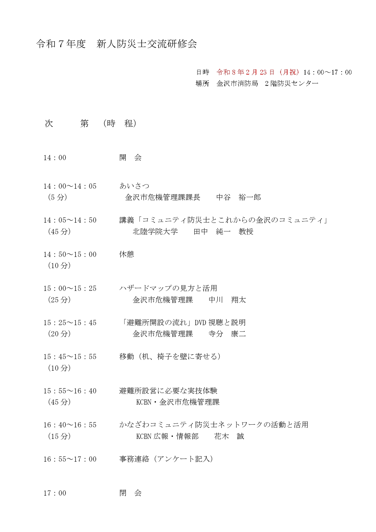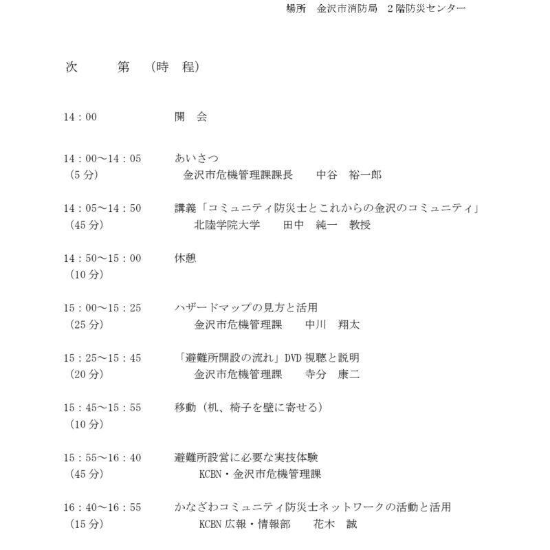 開催場所 :金沢市消防局 2 階防災センター (金沢市泉本町7丁目9-2)